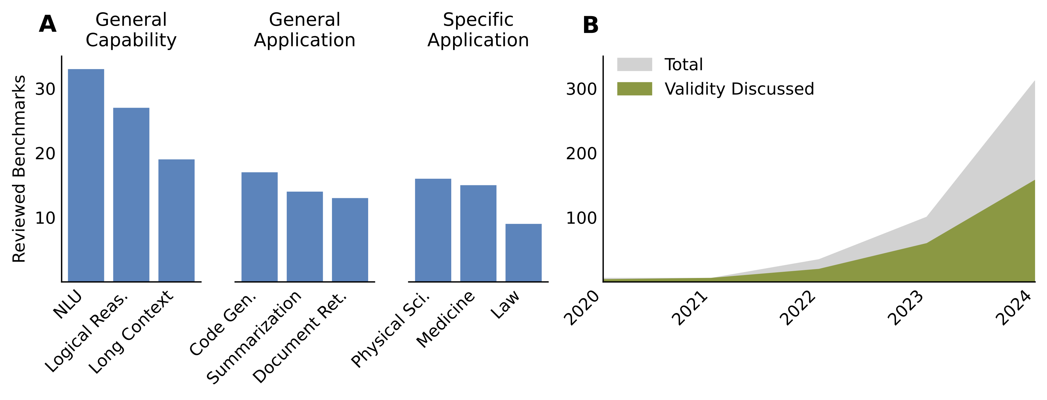 Summary of reviewed articles. (A) Three most common categories of benchmark phenomena, grouped into general capabilities, general applications, and specific applications. (B) Number of articles by publication year and number which discuss the construct validity of their benchmark.