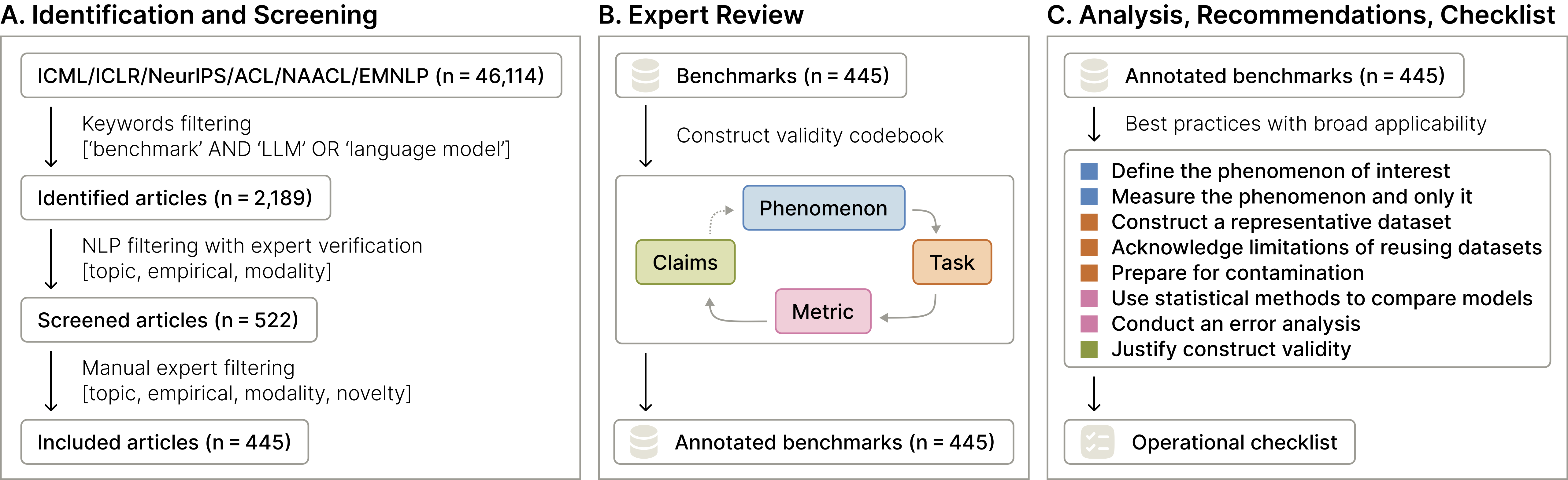 Systematic review process. (A) Identification and screening from relevant proceedings. (B) In-depth review and annotation of included benchmarks. A phenomenon is operationalised via a task, scored with a metric, to support a claim about this phenomenon. (C) Synthesis of best practices.